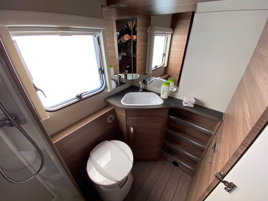 Wirklich schön ist, dass bis 5 Personen nichts umgebaut oder verräumt werden muss. Für eine 6. oder 7. Person müsste dann lediglich der Tisch in der Sitzgruppe abgesenkt werden. Aber auch das geht problemlos und schnell. Der Knaus 580QS Silveredition bietet erstaunlich viel Platz und Stauraum. Überall sind Fächer und Schubladen. Auch große Dinge können über eine, für diese Sonderedition angefertigte Seitentür, gut untergebracht werden. Das Bad ist wunderschön und überaus großräumig. Sogar die Dusche ist von der Toilette getrennt.